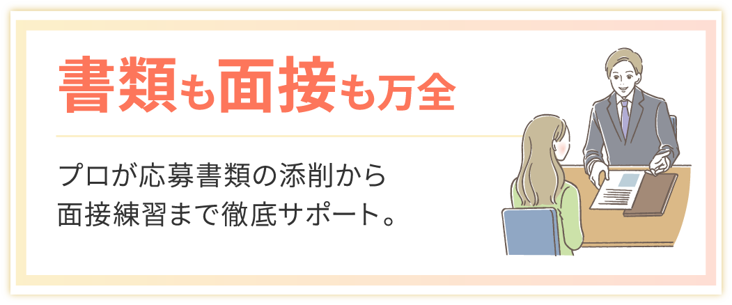 書類の書き方から面接対策まで、専門のスタッフが丁寧にサポートします。履歴書・職務経歴書の添削や、模擬面接などで自信を持って本番に臨めるよう準備します。