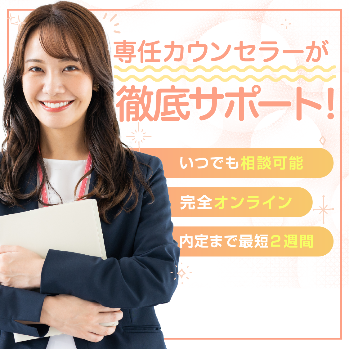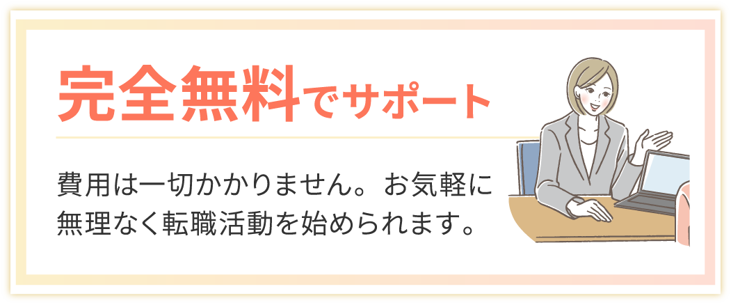 完全無料でご利用いただけます。求人紹介から入社後のフォローまで、全てのサポートが無料ですので、安心してご相談ください。
